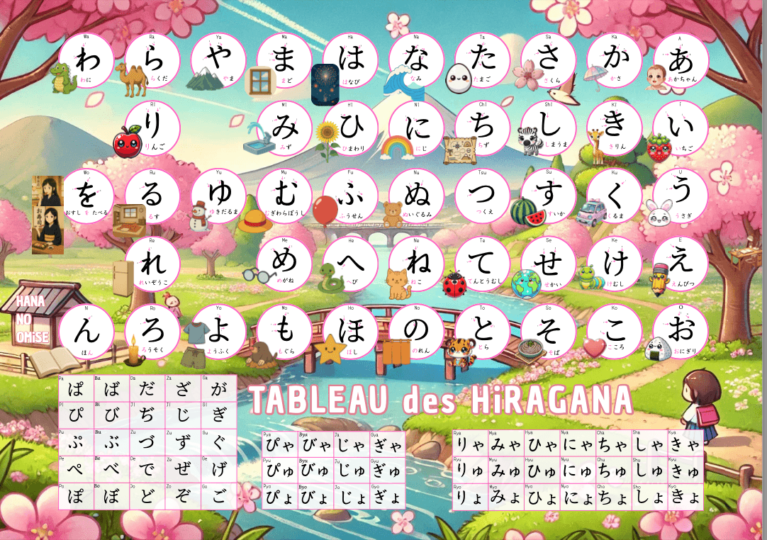 Le pack de 10 tableaux A4 à télécharger comprend 5 tableaux de Hiragana + 5 tableaux de Katakana, avec des variations de couleurs et de design. Ils sont disponibles uniquement en téléchargement. Ils peuvent être utilisés de multiples façons :